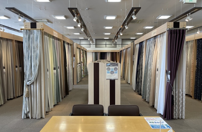 自社国内工場で縫製するオーダーカーテン専門店です。W200cm×H240cmを目安に、両開き1組ドレープ10,000円~/レース7,000円~(税別)の均一価格。店内には実物の吊りサンプルを多数ご用意し、ブラインドやロールスクリーンなどの窓まわり商品も豊富に取り揃え、暮らしや空間に合わせたご提案を行っています。新築・リフォーム・吊り替えまで、採寸・施工にも対応しています。見積は無料です。