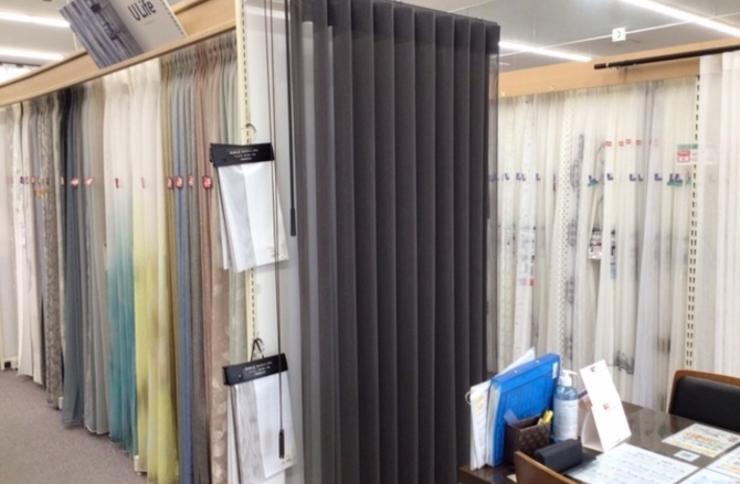 200坪の売場に専門店ならではの圧倒的な品揃え。カーテンやブラインドなど豊富なサンプルを取り揃えており、実際に手に取って選べると好評です。