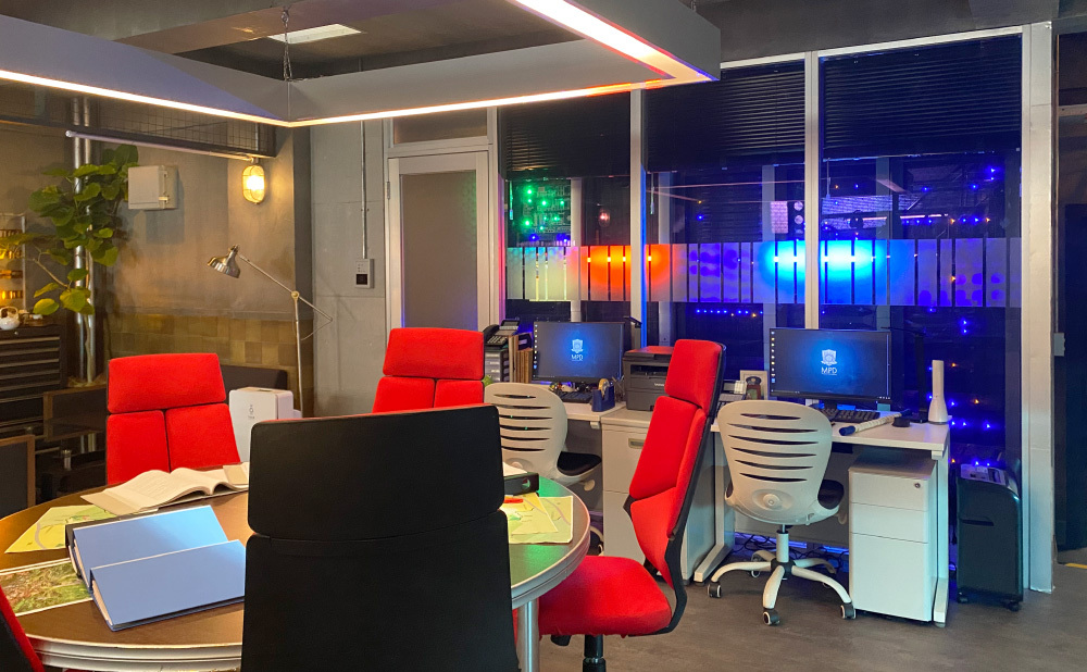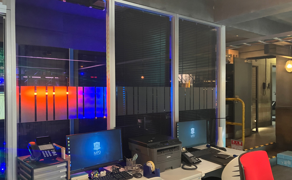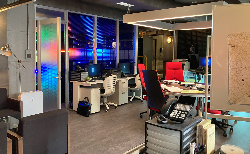 同じく映画に登場する、緊急事案対応取調班に、ヨコ型ブラインド「シルキーRDS」が使われています。ブラックの小物や機器に合わせて、ブラインドのスラットカラーもブラックにすることで、お部屋全体に統一感が出ています。また、日射熱を反射し、室内温度上昇を抑える効果のある「遮熱」のスラットなら、1日中快適な空間づくりを実現します。