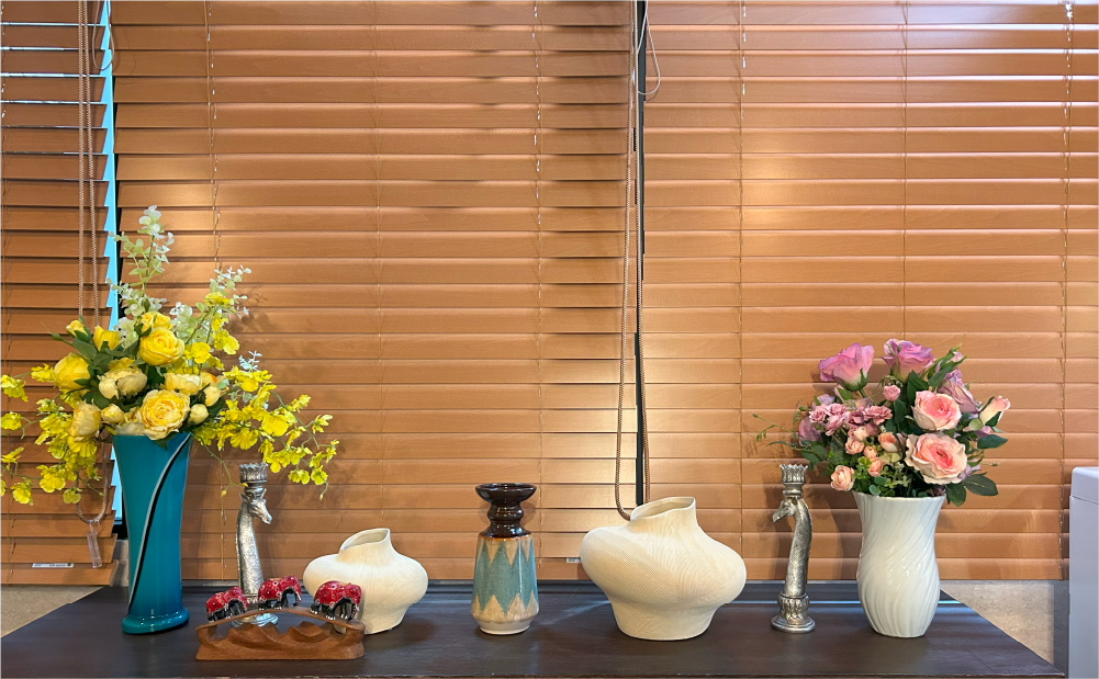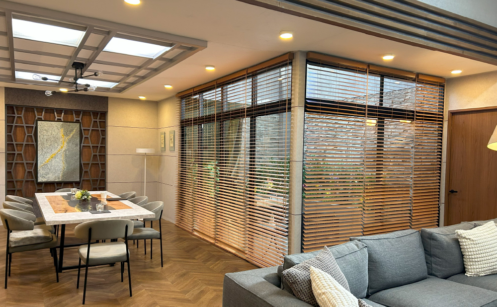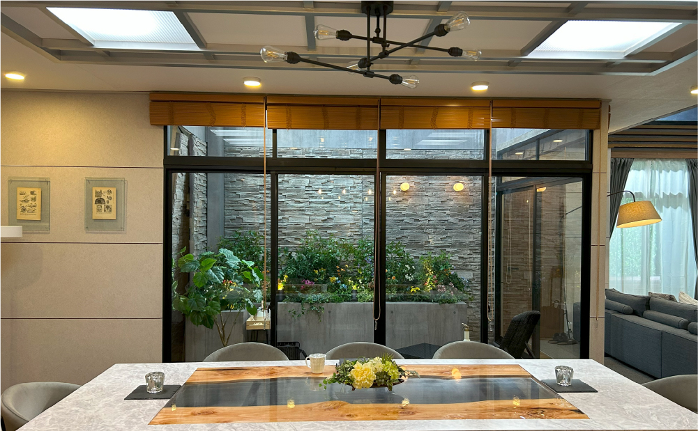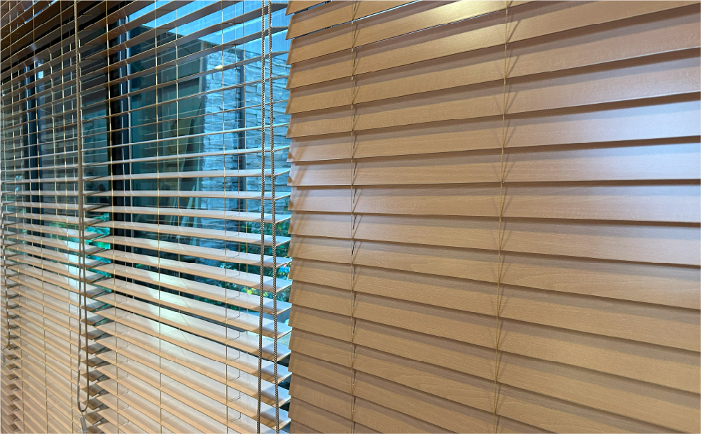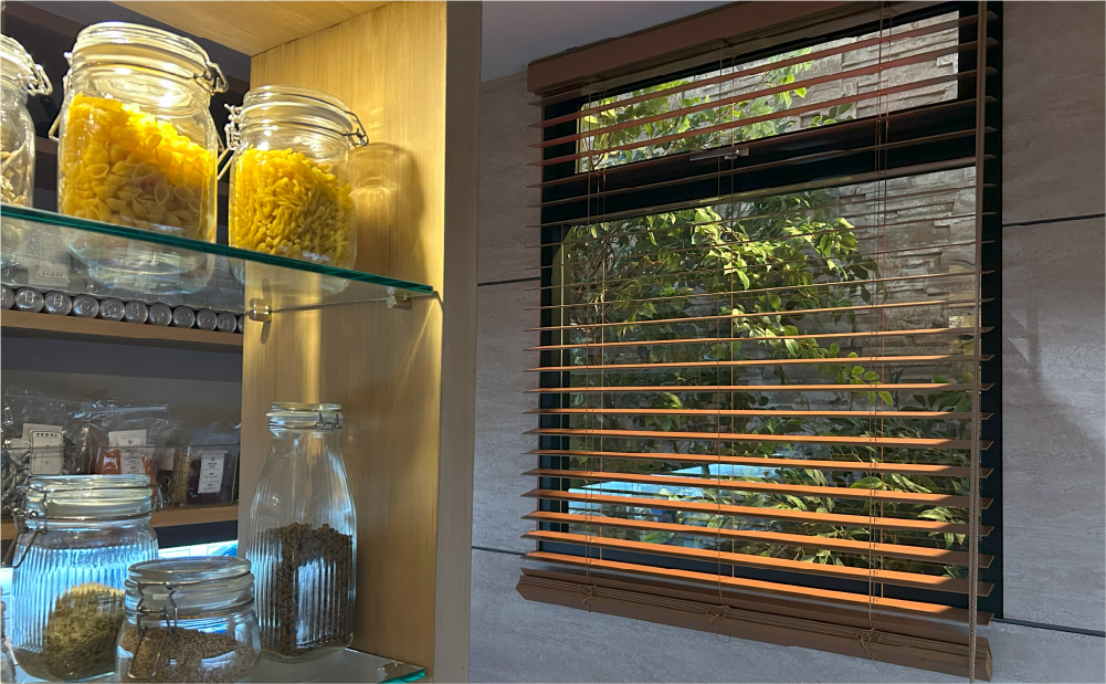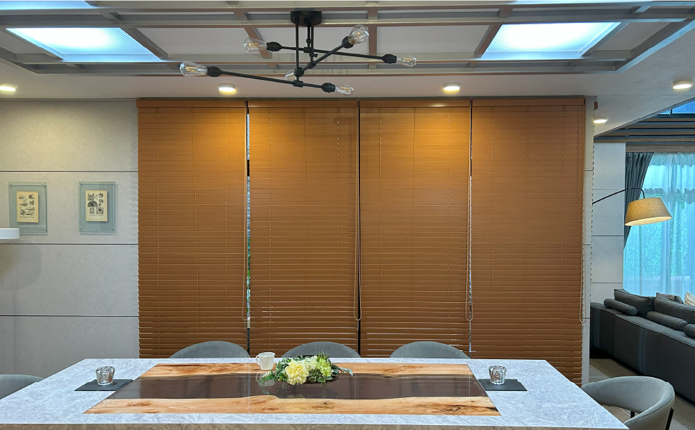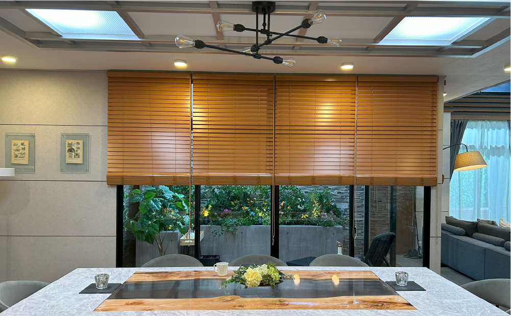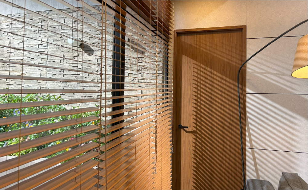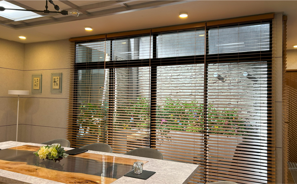 高級感のある美しい木目が特長のスラットは、インテリアに合わせて選べる73色の豊富なラインナップ。なかでも「エコ」は、集成材を利用した環境にやさしいスラットです。オーダーメイドなので、窓の大きなリビング・ダイニングだけでなく、キッチンなどの小さいサイズの窓にもぴったり取付けられます。