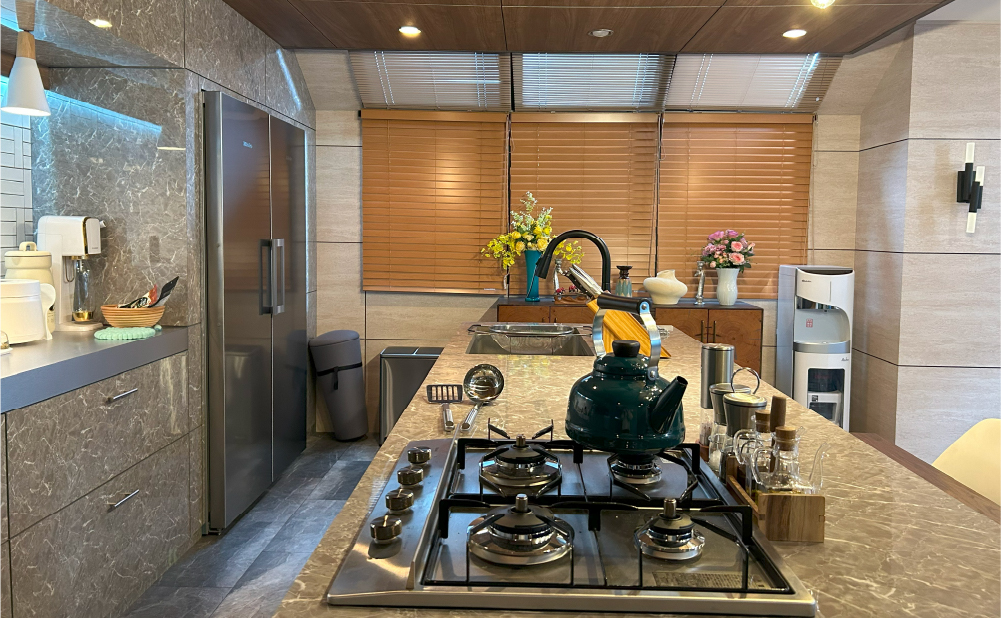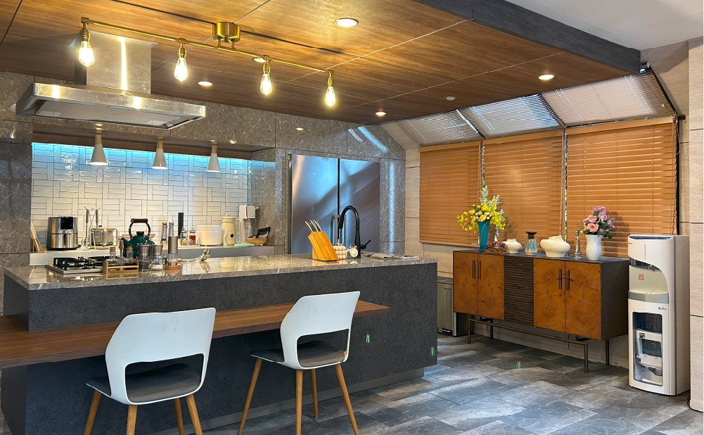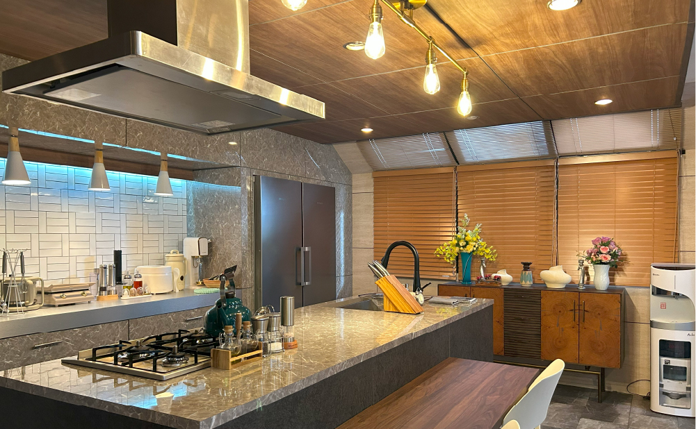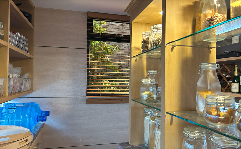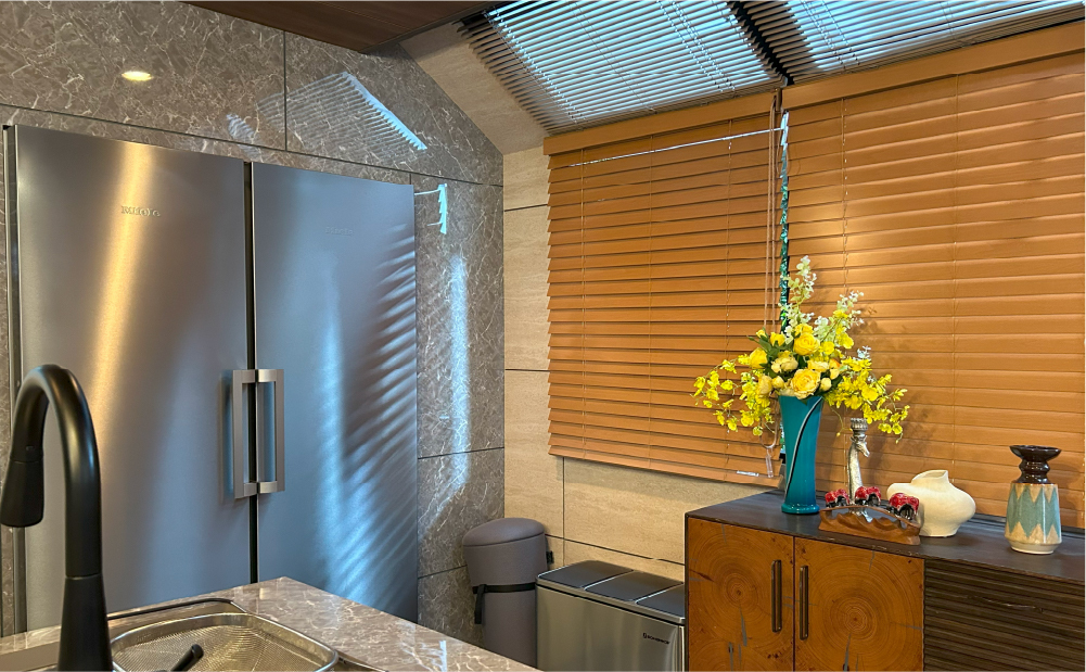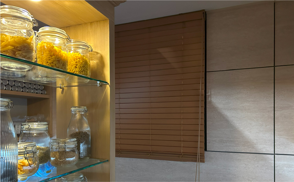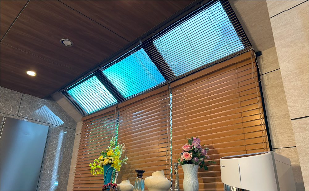 同じく主人公の自宅のキッチンに、ヨコ型ブラインド「シルキー 傾斜窓」が使われています。傾斜面にある窓に取付けできるブラインドで、日射しの気になる明かり採りの高窓などにおすすめ。同じキッチンに登場する木製ブラインドと色味を合わせ、マットカフェブラウンのスラットにすることで、まとまりのある空間に仕上げています。