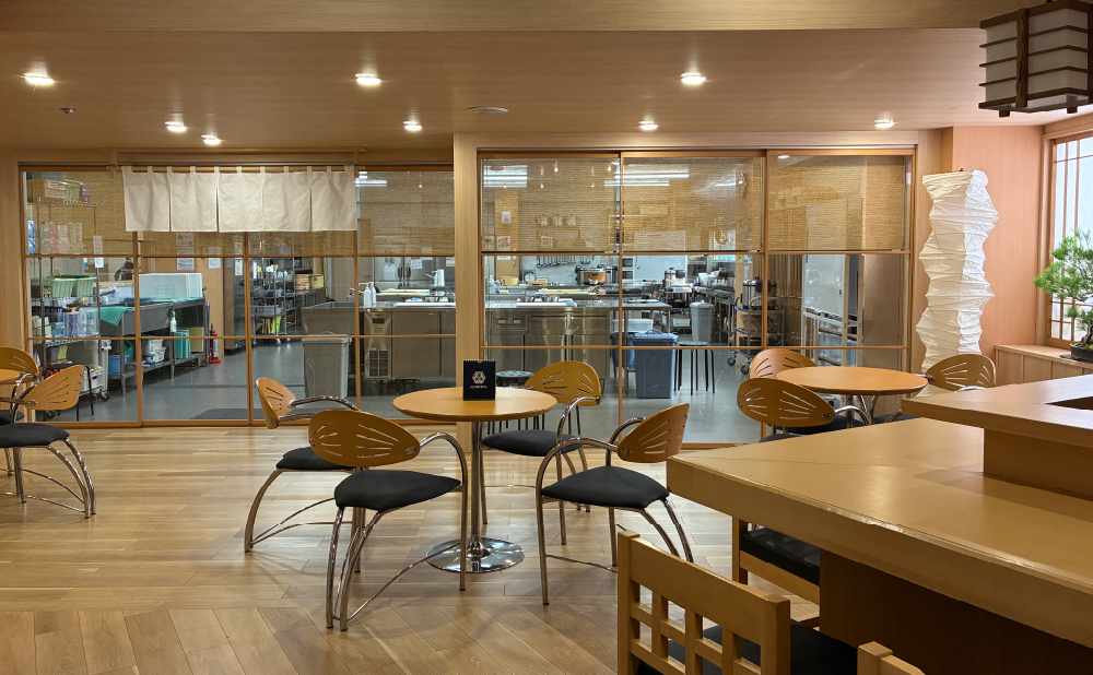 同じく休憩室の別の窓にも「パーフェクトシルキー チェーン」が使われています。「ビジュアルカラー」のスラットは、木目調・石目調をデザインした全12種類で、お部屋のスタイルに合わせてお選びいただけます。木目調のスラット「ウッドブラウン」は、温もりある空間に仕上げます。
