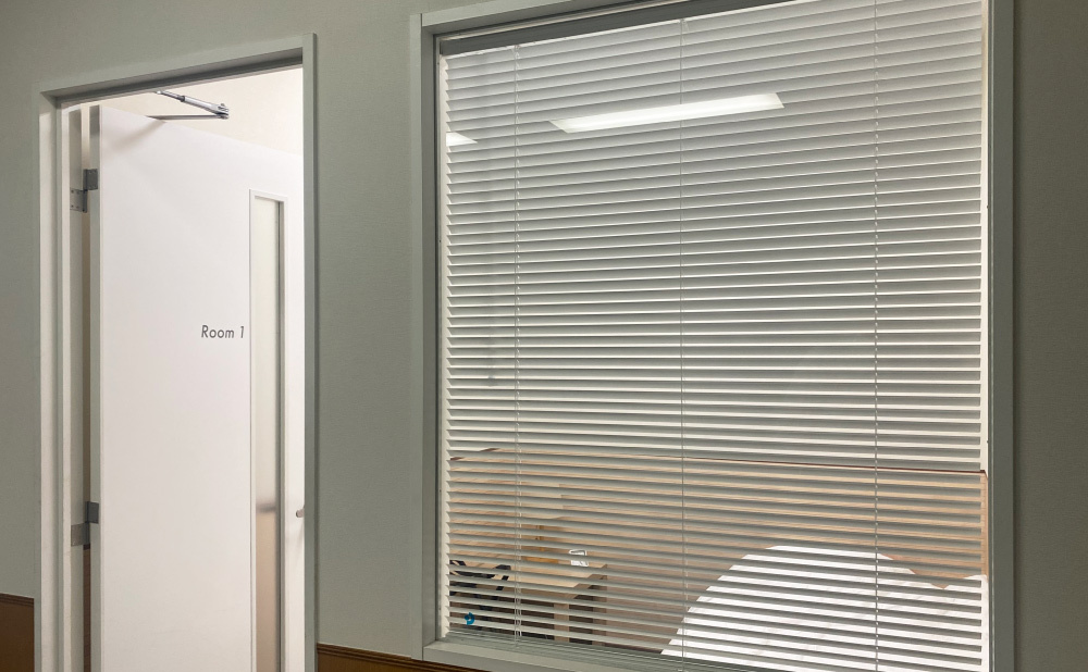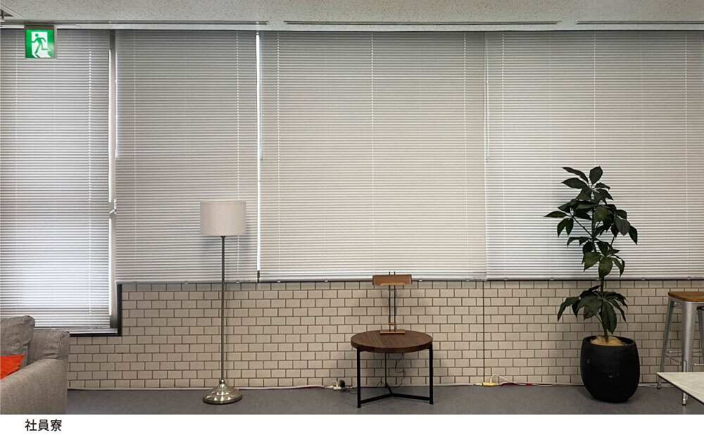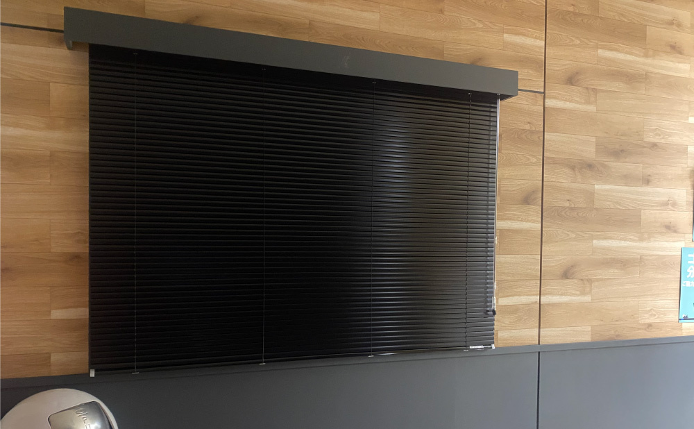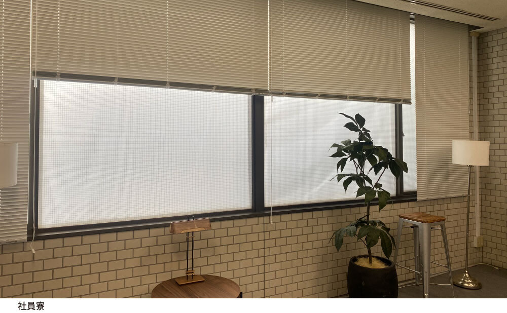 同じくドラマに登場するオフィスの廊下に、ヨコ型ブラインド「シルキーRDS」が使われています。日射反射を高め、室内温度の上昇を抑える効果のある「遮熱」スラットは、日射しの気になる空間におすすめ。ツヤのないマットな質感の「マットブラック」のカラーが空間を引き締め、メリハリある印象に仕上げています。