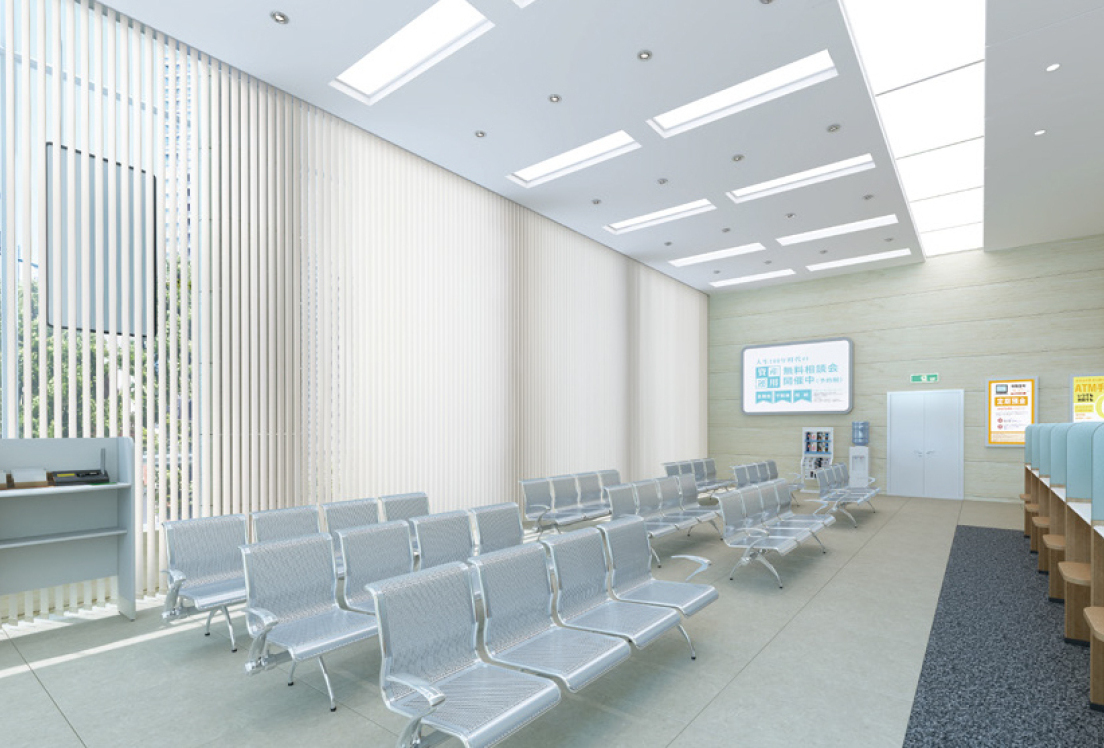 バーチカルブラインド 傾斜窓 傾斜台形の窓にすっきりと納まるオフィス・店舗・施設向けのタテ型ブラインド。